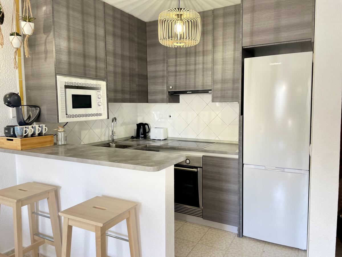 El salón es luminoso y espacioso, equipado con un sofá cama confortable y una mesa de comedor, creando un ambiente perfecto para relajarse o compartir momentos con amigos y familiares. La cocina abierta está completamente equipada con electrodomésticos modernos, lo que facilita la preparación de deliciosas comidas.